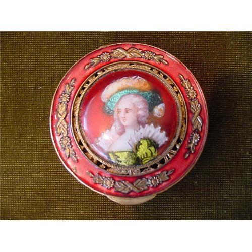 Exceptionally vivid 19th century enamelled viniagrette box with a beautiful woman. This striking engraved brass box has a deep red enamel base and an enamelled woman in a brilliant chartreuse dress and turquoise hat. The box measures 2" in diameter and is 1/2" deep with unique brass filigree on the interior lid. There is a very slight enamel loss near the lower left rim that blends with the color of the brass relief - otherwise the condition is excellent. Circa 1880.