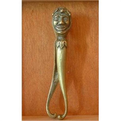 This is a French Brass Nutcracker; both sides have well modeled busts of a Jester. A clown character in royalty, a jester or fool is a specific type of clown mostly associated with the Middle Ages. The modeling and finish on this brass nutcracker are quite nice; it has a medium gold brass patina. The insides have a striated finish, and are hollowed out to hold two sizes of nuts. This item is in very good condition except for a modest bit of wear. The date is circa 1920. This item measures (in inches): 7.3 tall X 1.3 wide X 1.9 deep; the weight is 11.5 Oz. Shipping and Insurance by USPS Priority Mail within the U.S. is $5.00. Thanks for looking and good luck bidding!