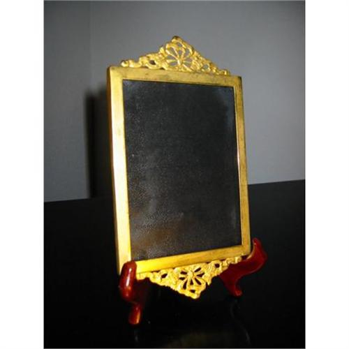 This attractive 4.5 inch by 8 inch brass picture frame ornate with details. Gilt with French motif situated on black leather background, and covered with glass. It has green felt/velvet, and in wonderful vintage condition. This Frame would make a nice conversation accessory, and something to think about.