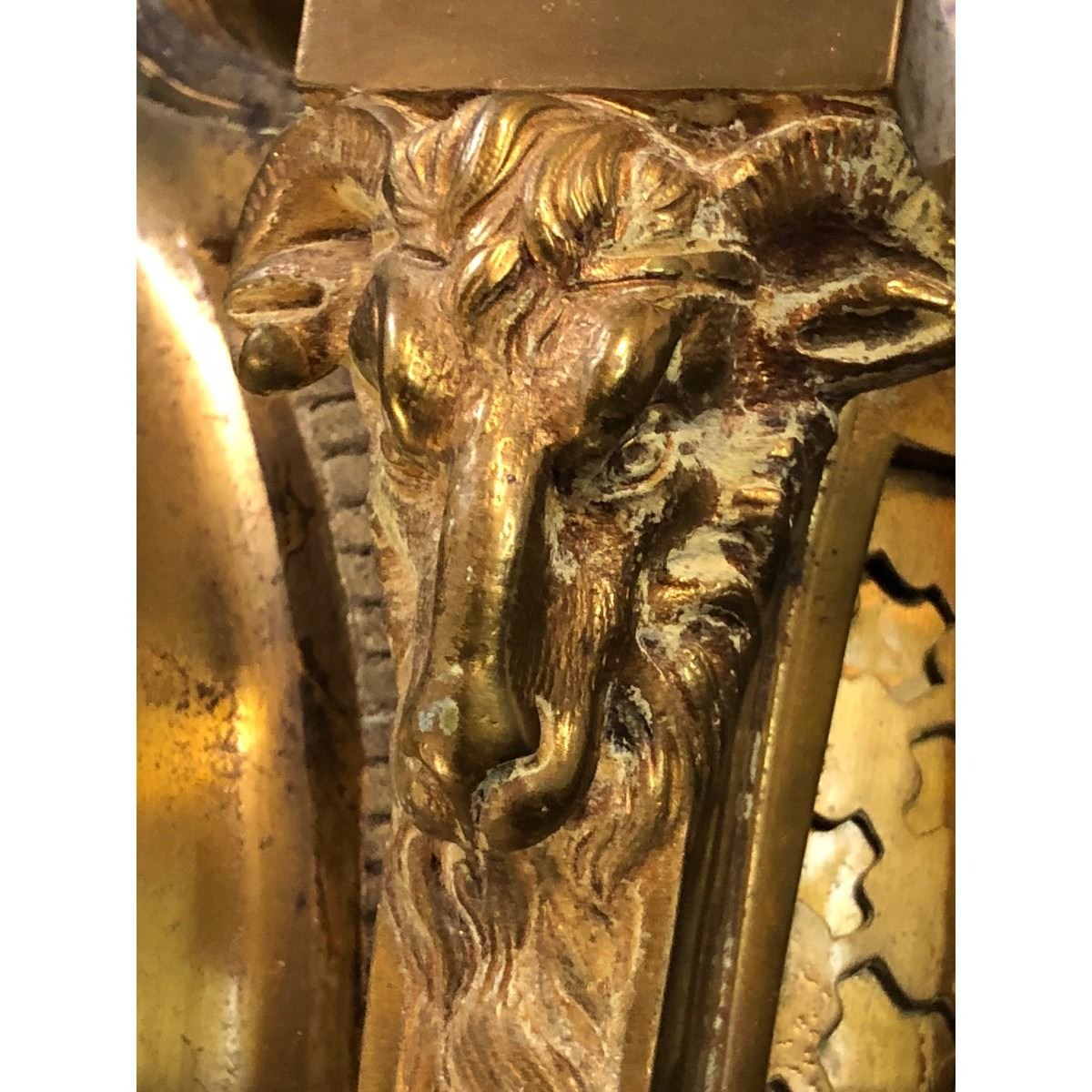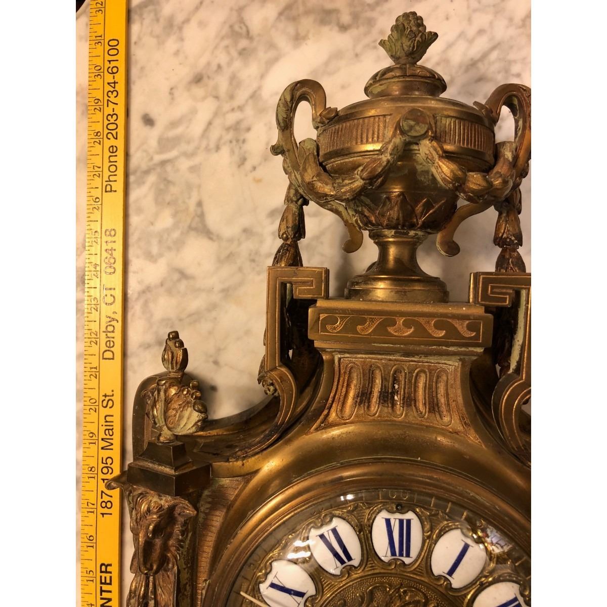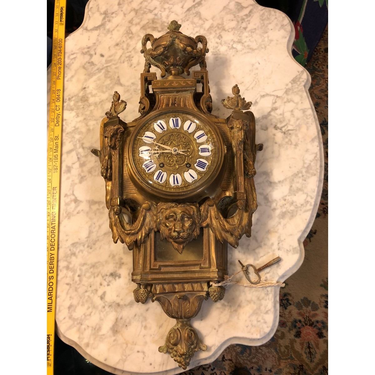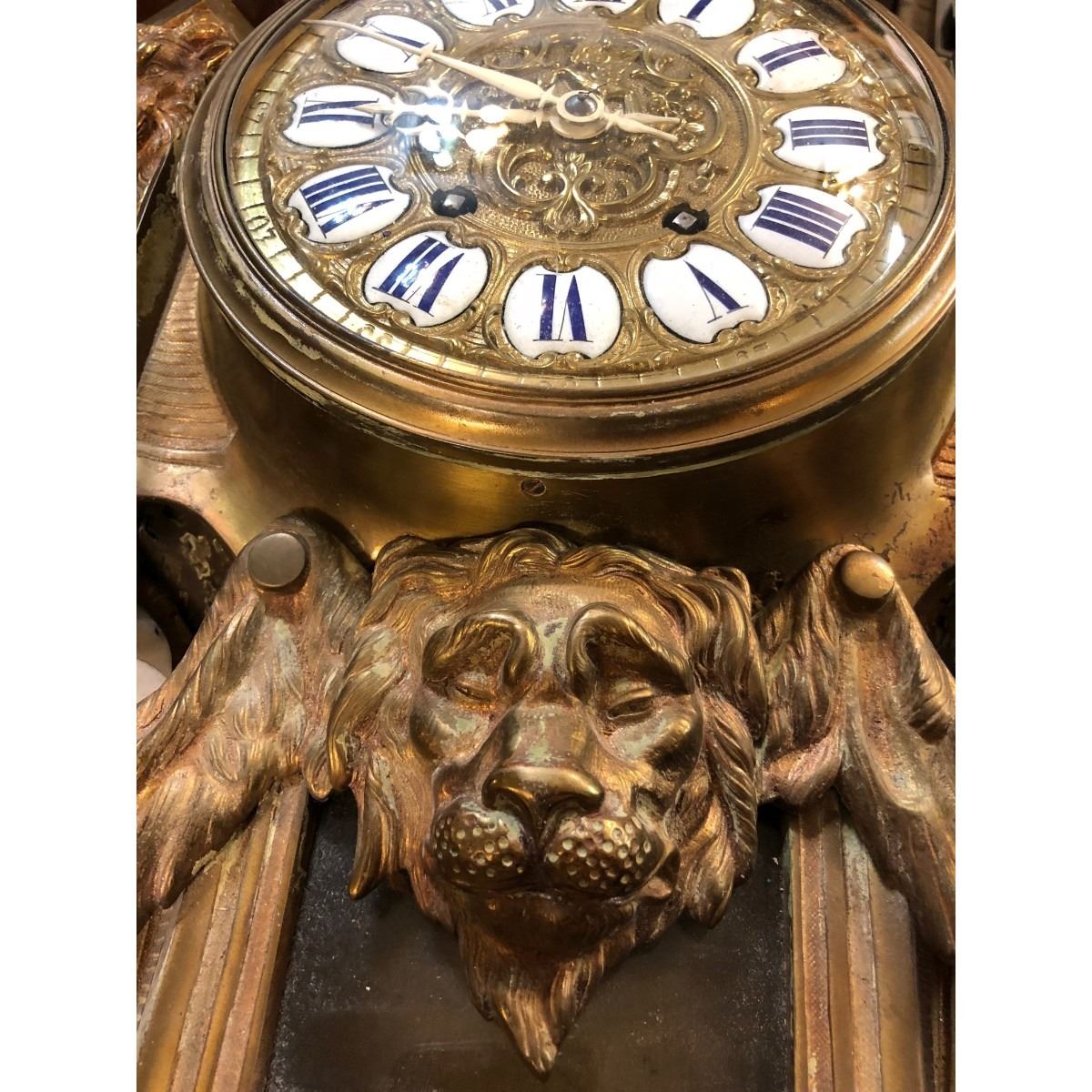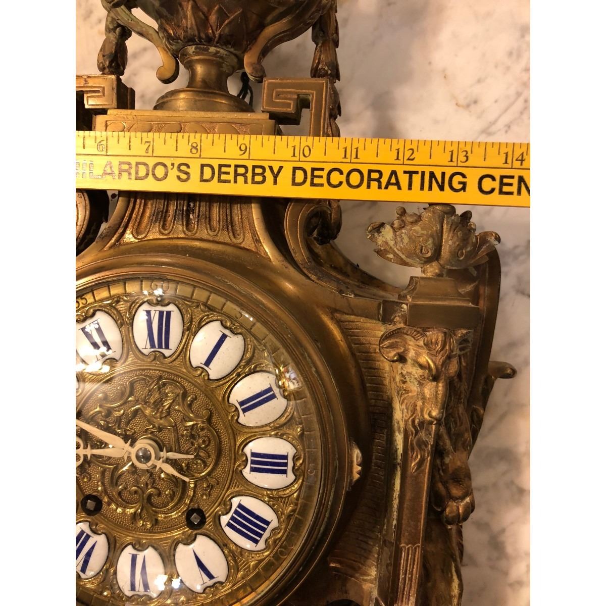 French Bronze Cartel Clock. Porcelain dial numbers, lion's head under clock face, and rams heads adorn sides, urn top with draping. A beautiful cartel clock.