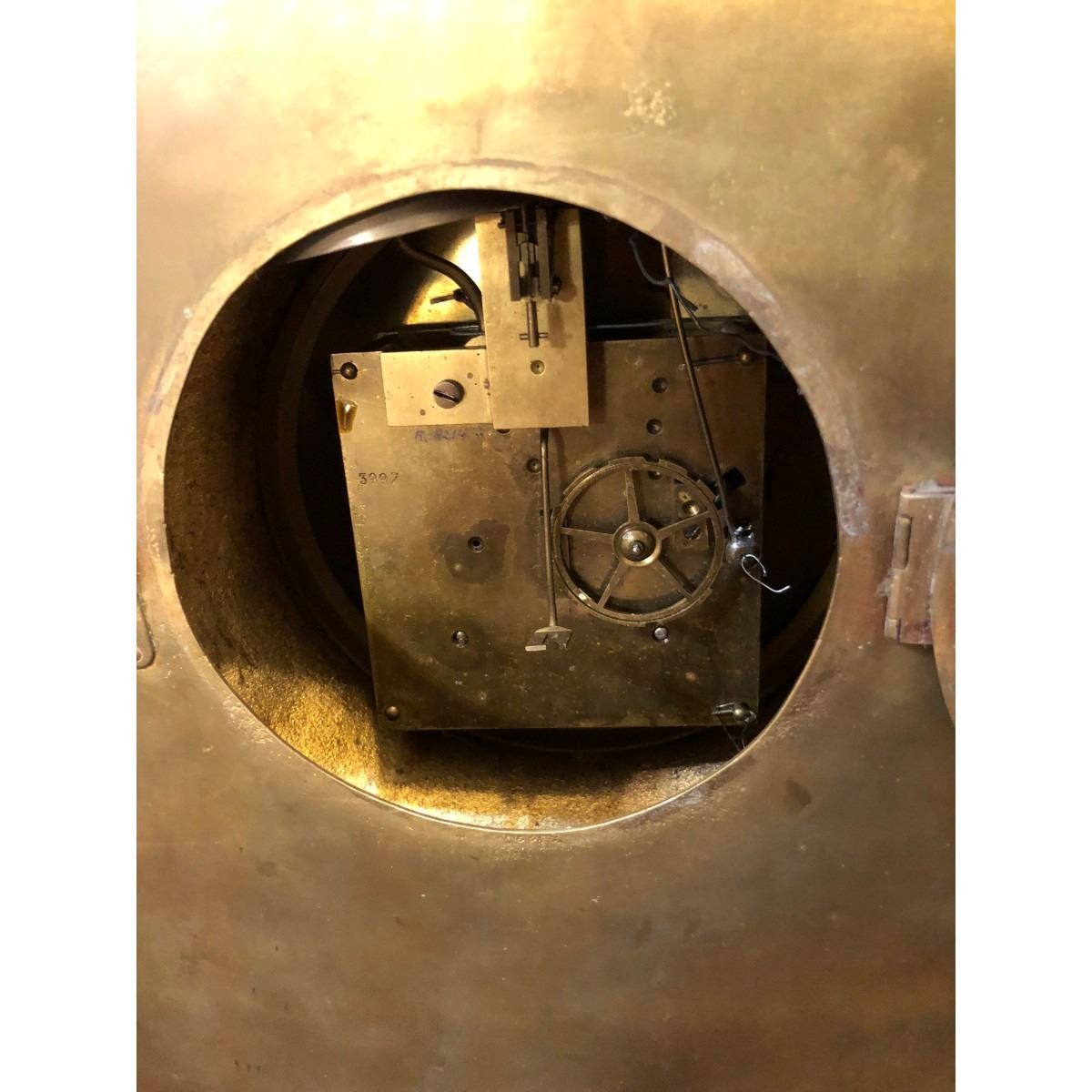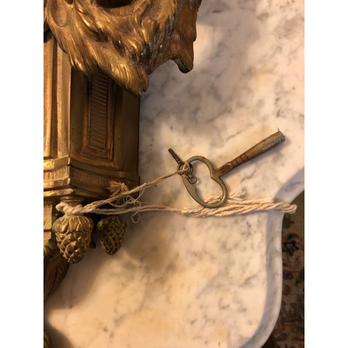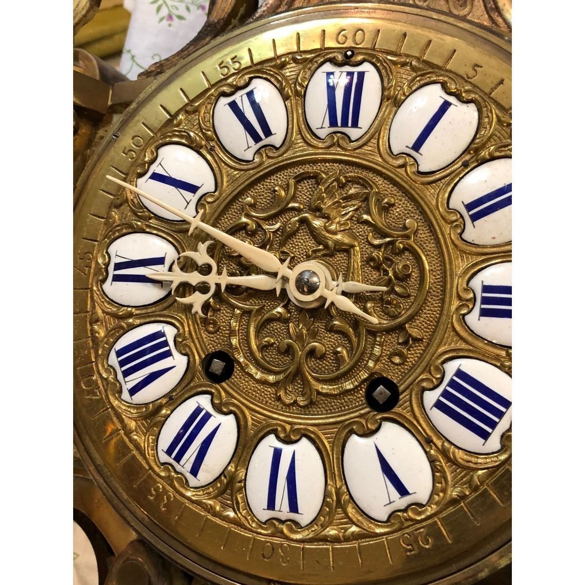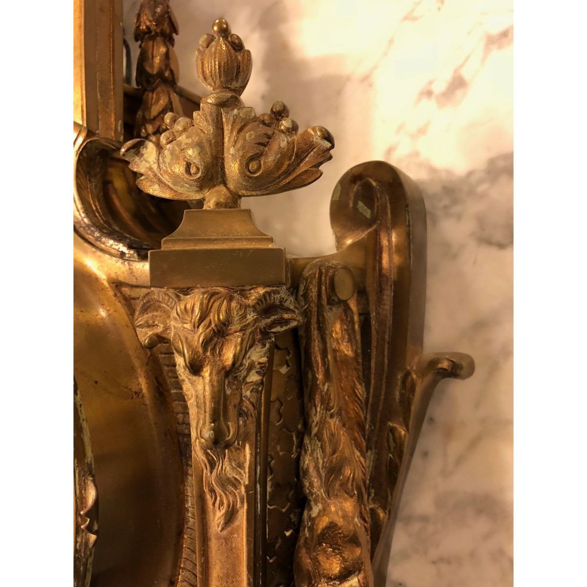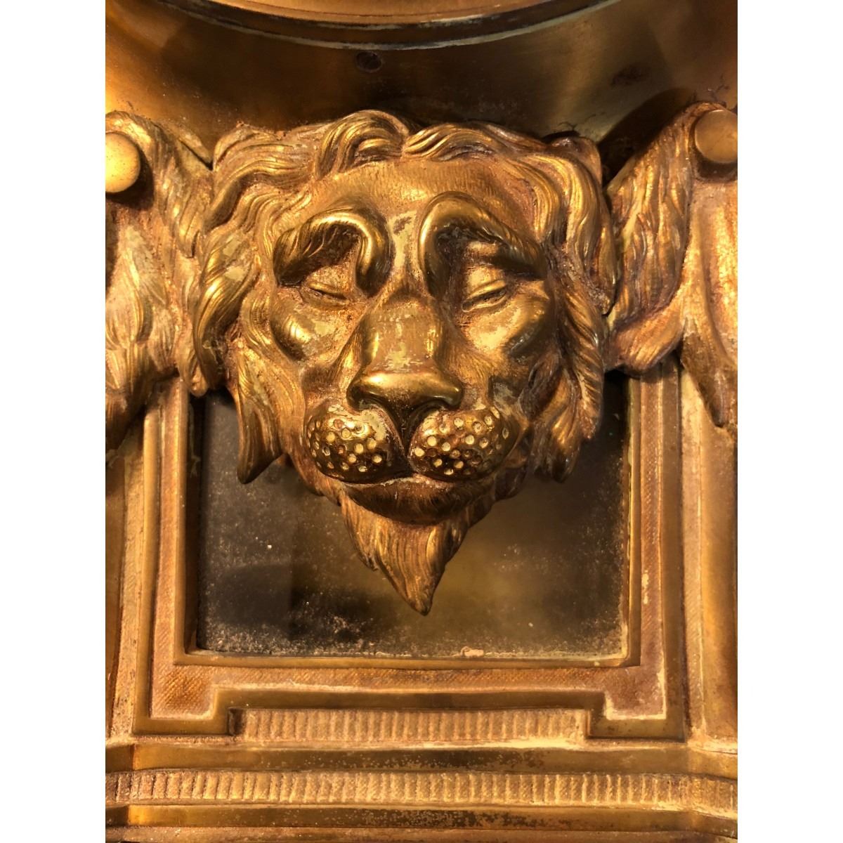 French Bronze Cartel Clock. Porcelain dial numbers, lion's head under clock face, and rams heads adorn sides, urn top with draping. A beautiful cartel clock.