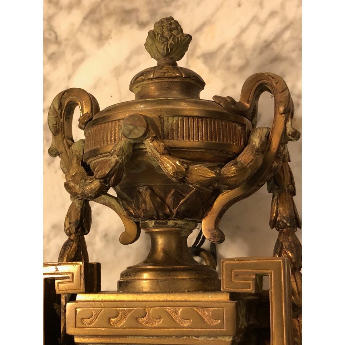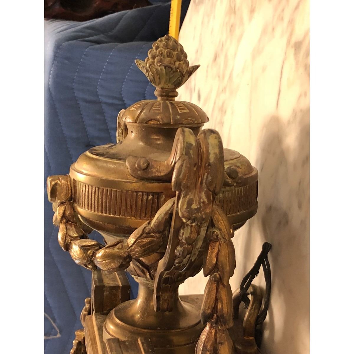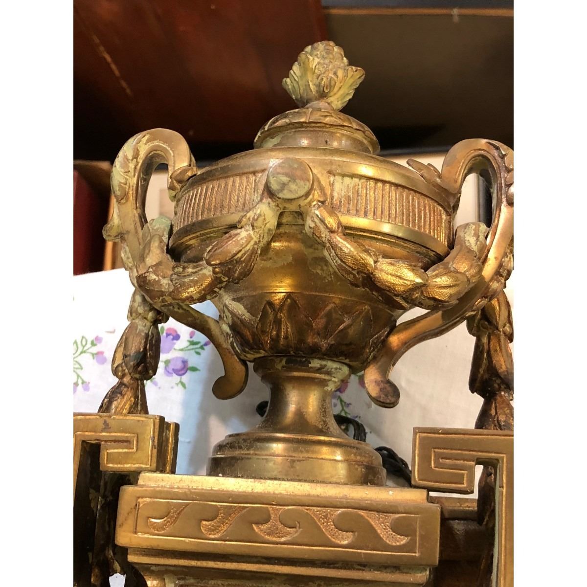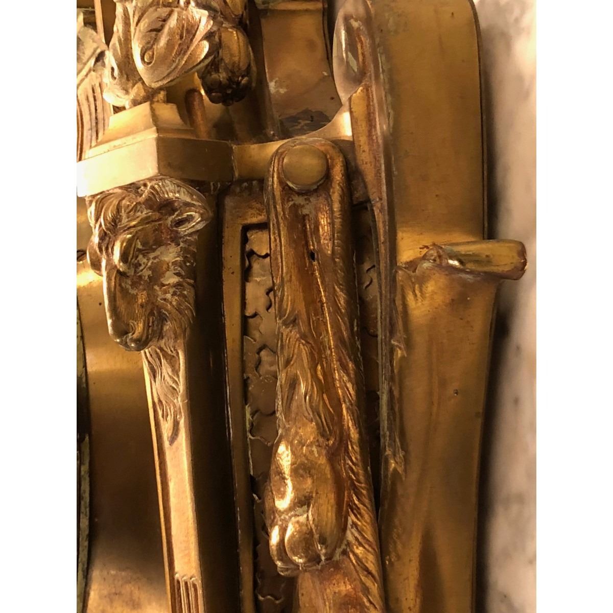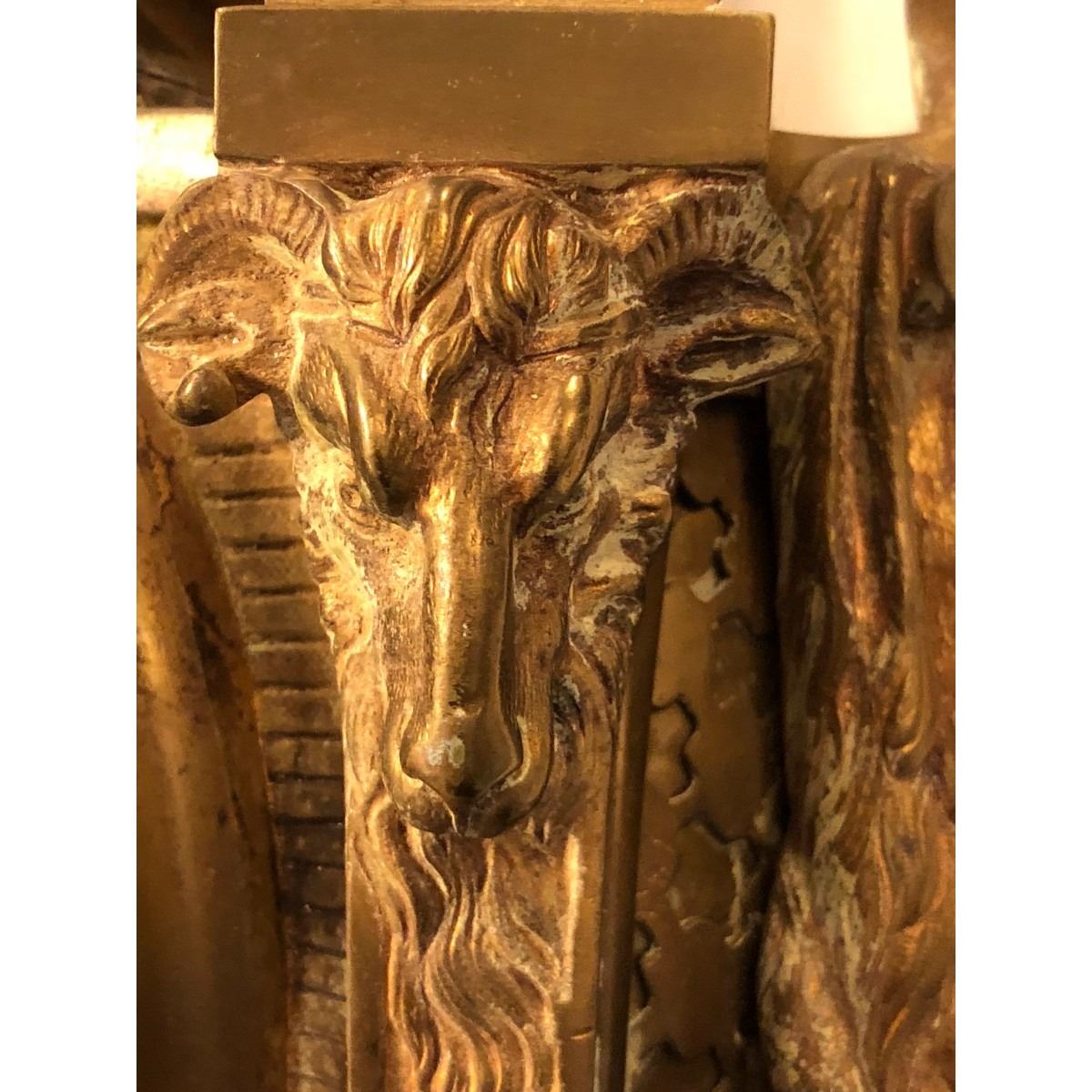 French Bronze Cartel Clock. Porcelain dial numbers, lion's head under clock face, and rams heads adorn sides, urn top with draping. A beautiful cartel clock.