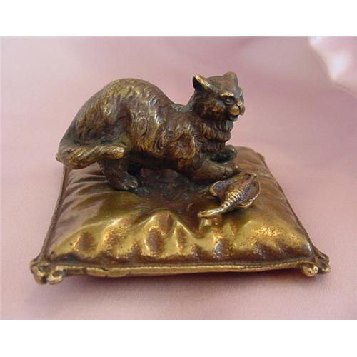Wonderful 19th C. French bronze of a cat with a dead bird on a pillow. This bronze has a beautiful patina with light guilding and very fine detail. The pillow measures 2 3/4" by 2 3/4". The bronze is approximately 2" tall to top of cat. The cat itself is 2" long and 1 1/4" tall. This small bronze has a nice heavy weight of 12 ounces. Circa 1850. Excellent condition.