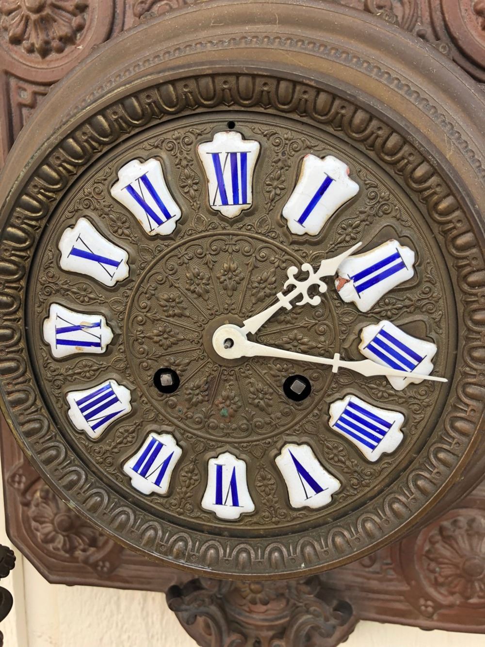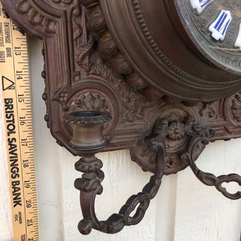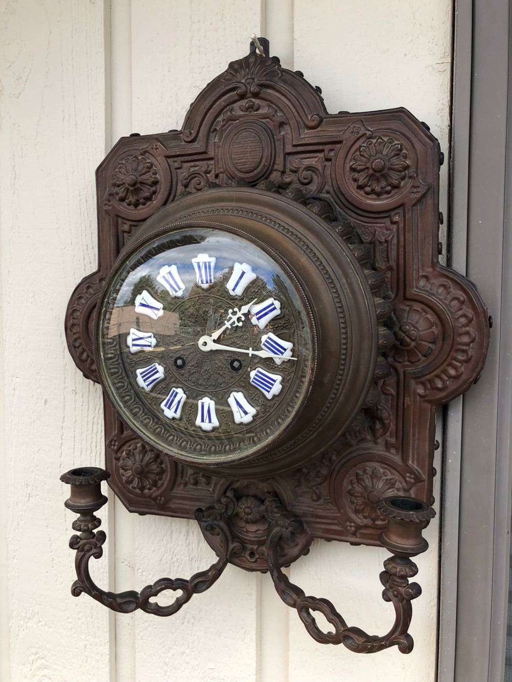 Victorian Era, all original, Bronze French walll clock with brass enamelled numerials, candle sconces, original pendulum, measures approx. 21 1/2" tall x 13" wide. Clock is part of Chatham, MA clock collection.
