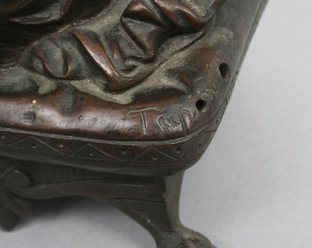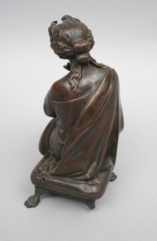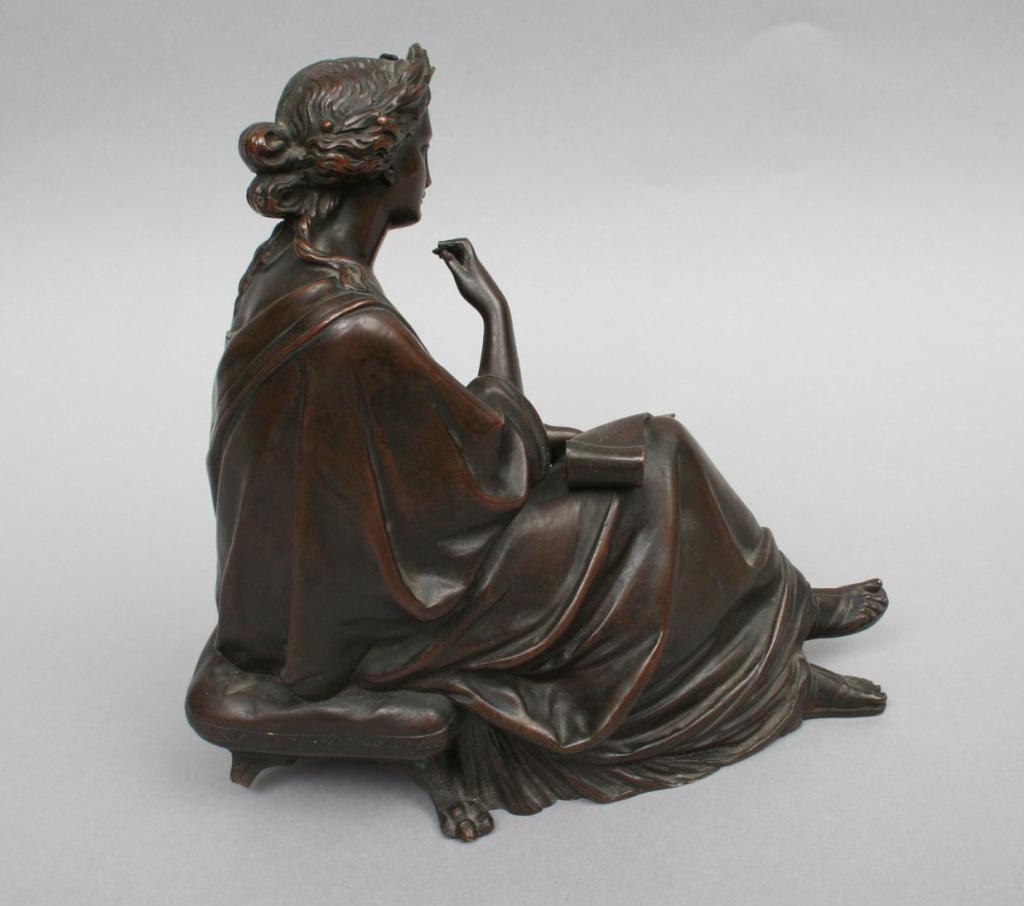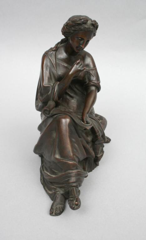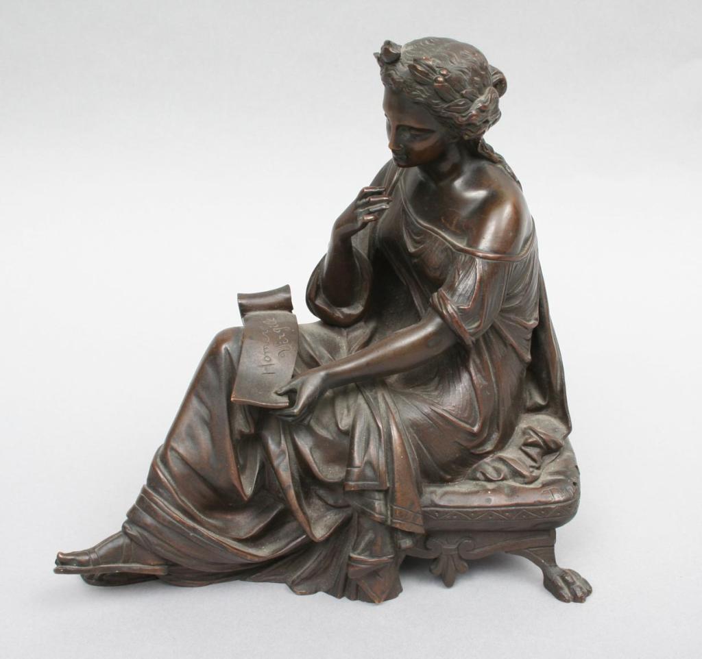 19th century, cast in bronze as a neoclassical style beauty contemplating the works of Homer and Virgil, covered in a warm brownish gold patination, signed indistinctly on the cushion upon which she sits. 8 1/2"H. 9"W. 4 1/4"D. Condition: possibly formerly a clock or garniture fitting, lacking base, otherwise good.