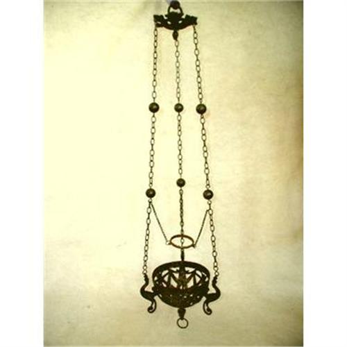 </font></strong>Beautiful French bronze sanctuary light holder or fixture,18th to early 19th century used in front of an alter can well be respected for the inteded use and beauty but enjoyed currently as a candle or plant holder. Every piece including each bronze ring was hand forged. Slight difference in the size of each loop due to this fact. Top leaf design canopy with hook and finial progresses to the long chains with 6 bronze intermittent balls. Solid ring below would hold a candle or small plant. The main ornate capsule flanked by three delicate birds on all sides has Latin raised wording surrounding the lip. Larger finial and loop at bottom. Aged nicely with beautiful patina. Measures 7D to hold a good size pot or large candle,7L X 35H. </font>