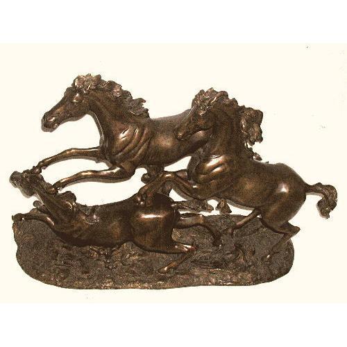 Large heavy French Bronze C.1920 sculpture of three handsome horses. Wonderful detail throughout,in particular their faces,flowing tails and the muscles seen in their chest and front legs. The tallest of the three is suspended in a broken tree stump with his front hoof resting on the mane of the leader lying down cradled in decorative brushy plant.The third one has a hoof resting on the back of the same. The base shows more plant life and another tree stump. Coloring is a rich bronze brown which reflects the light in different ways with the curve of the bronze. Excellent condition. Measures 21.5H X 11W X 33L.