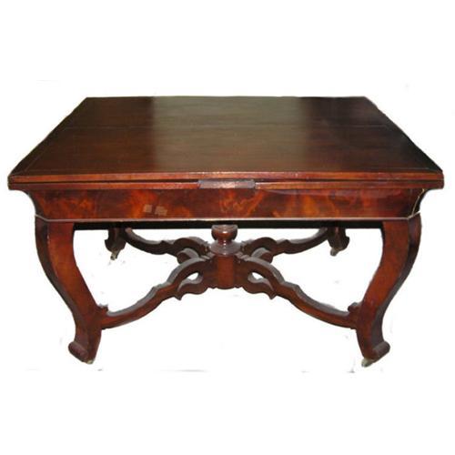 This antique French dining table is made from solid mahogany and is believed to date from the late 19th century. It features burl mahogany veneer on the skirt, pull-out leaves at each end, an x-stretcher with large finial, and brass casters. Measures 48" long, 39.25" wide and 29.25" high. With leaves in place it measures 90" (7' 6") long. Overall condition is good. There are some cracks to the leaves. This item resides on the upper west side of Manhattan ( New York city ) and may be seen by appointment.