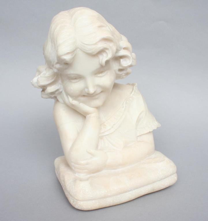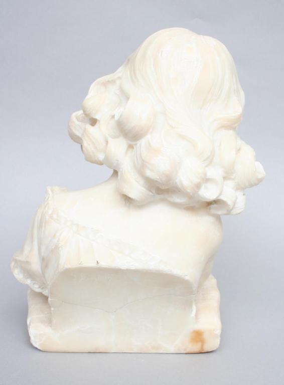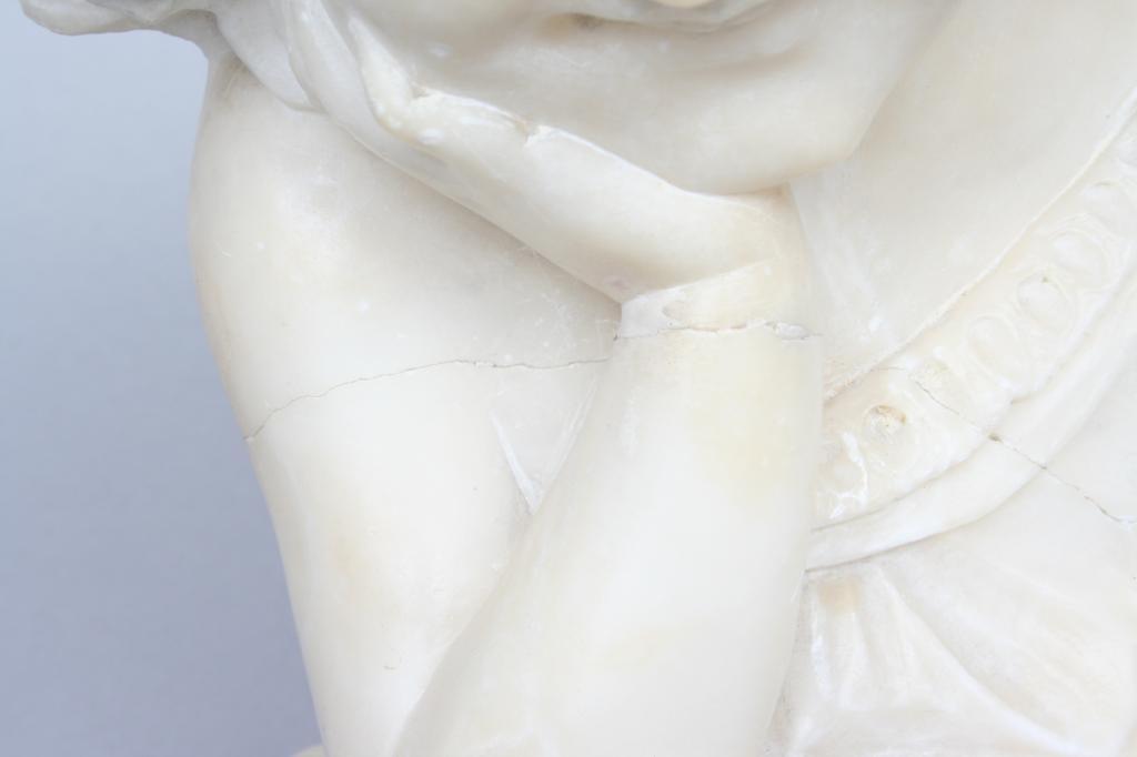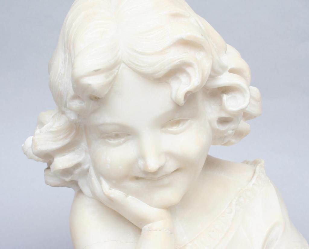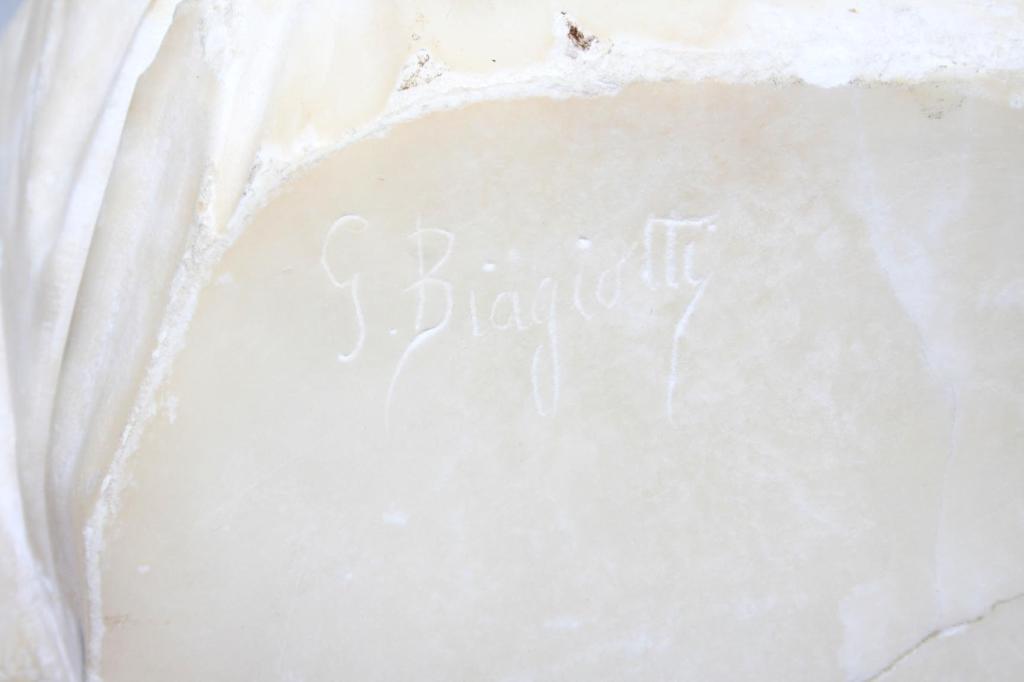 After P. Rigual, cast in iron as the bust of a classical style beauty, her hair caught in a diadem, signed on verso, raised on a marble base and black marblized column. 7"H (bust only). 16"H (base to top of bust). Condition: some light to moderate rust and pitting, loss to one rear corner of marble base.