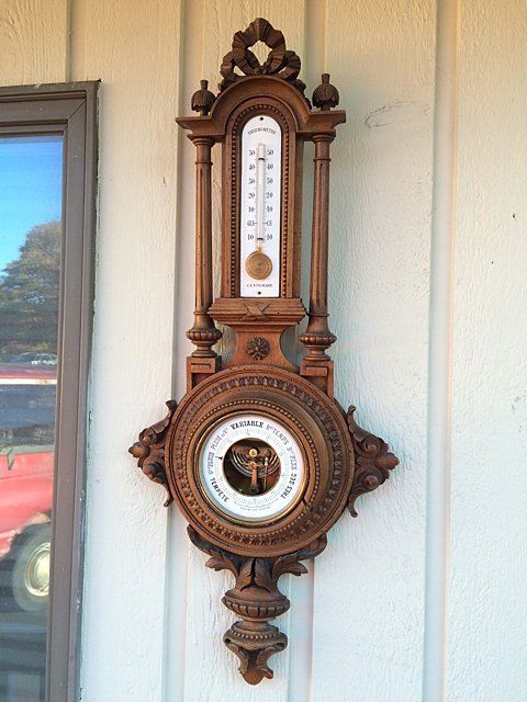 Antique French carved wall hanging barometer and thermometer. Ornate carved case, nice dials, missing glass face and crack seperation on barometer. Measures approx. 33" high x 14" wide x 4" deep.