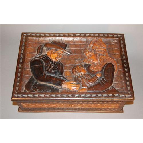 An interesting and fun antique French carved box. The pictures pretty much say it all. Would make a great cigar box or letter box. Carved from some type of hardwood - possibly oak and walnut. Circa 1900. A great gift idea! Serious inquiries welcome. Measures 14W x 10D x 5H.