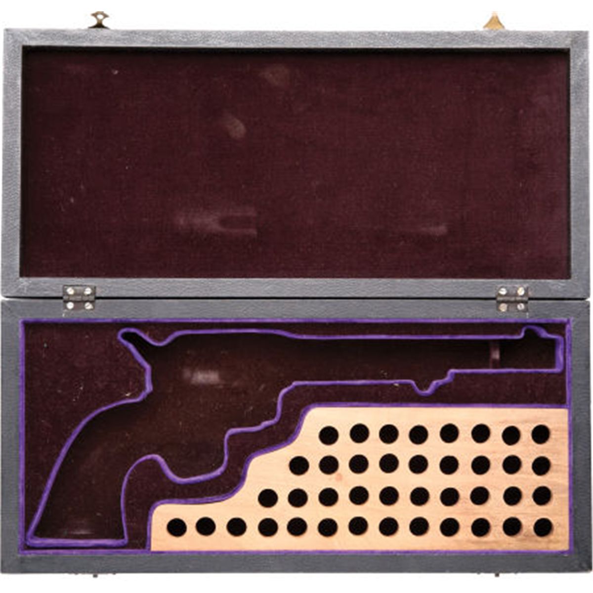 **French Cased Engraved Early Colt Single Action Revolver. Serial no. 97461, .45 caliber, 7 1/2-inch barrel with single-line Hartford address. Silver and gold-plated finish. Fine custom-engraved throughout with excellent stippling. Aftermarket walnut grips. Contained in black leatherette purple velvet-lined French style case with 40 cartridge wood block liner. Condition: Excellent as refinished and reconfigured, showing light handling storage wear and patina. Case fine.