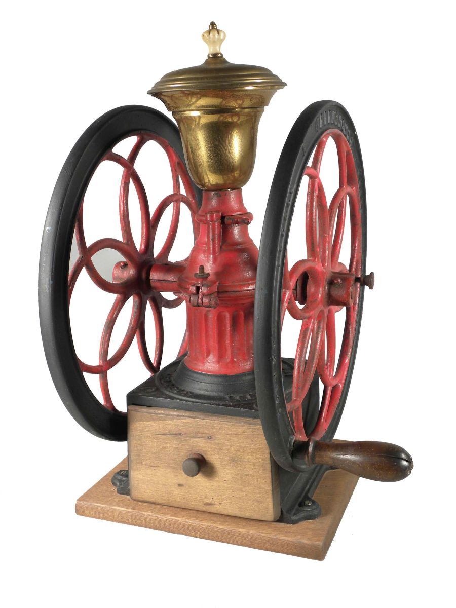 French Cast Iron Coffee Grinder #4 , Peugeut Freres A Valentignev Doubs Brevetes S.G.D.G. 23 inches tall X 17 inch wheel diameter.