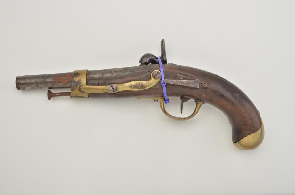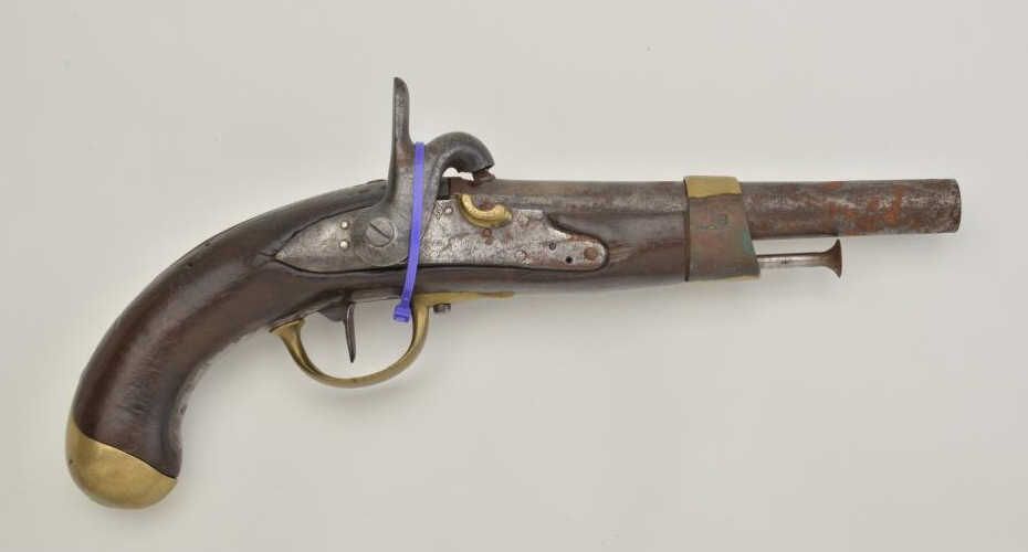 French Cavalry pistol in Napoleonic style converted from flintlock to percussion in arsenal manner; forged iron belt hook added possibly in Mexico as this gun found in old Mexico City collection and sold by Weston inthe 1950’s. Good, as found, out-of-attic condition; lock well-marked “Charleyville” arsenal and Manufac’d’ Imperial. Est.: $300-$600.