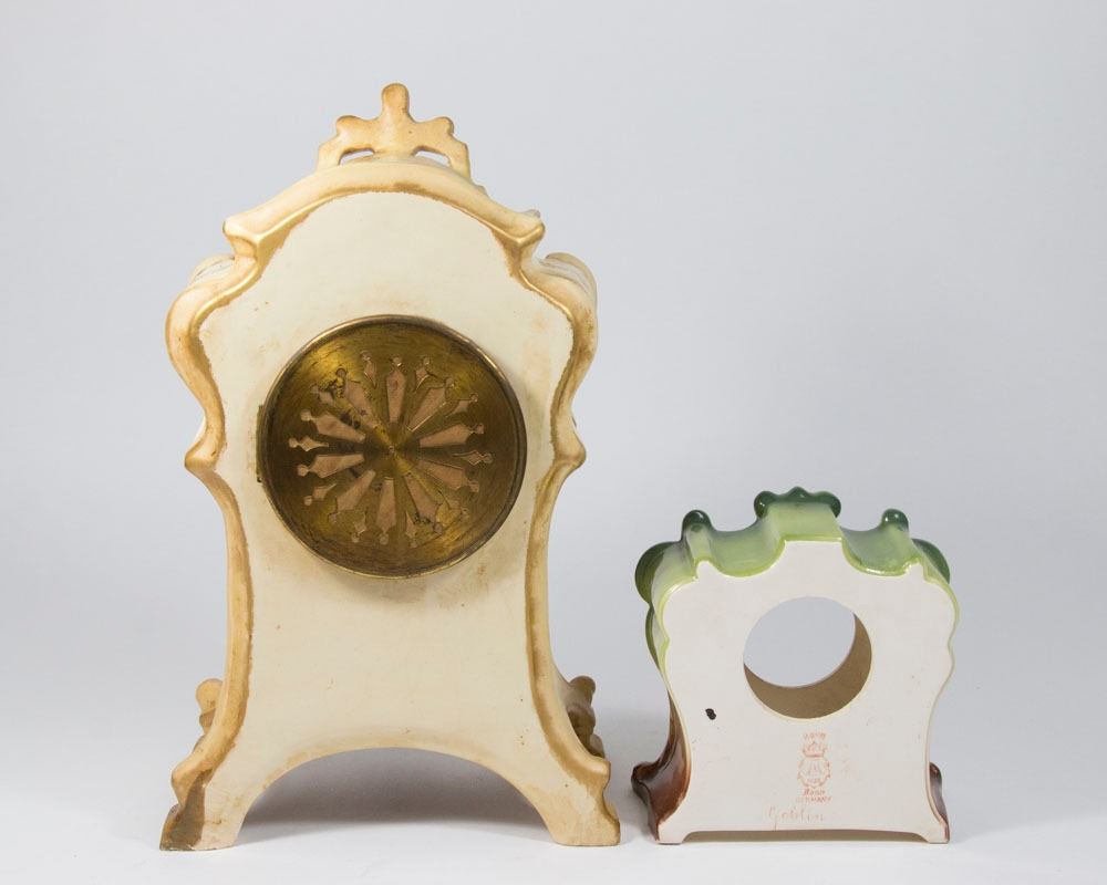 French ceramic mantel clock, leg on right, approx. 14" H. Royal Bonn clock case, approx. 6" H. (6055) Right leg repaired