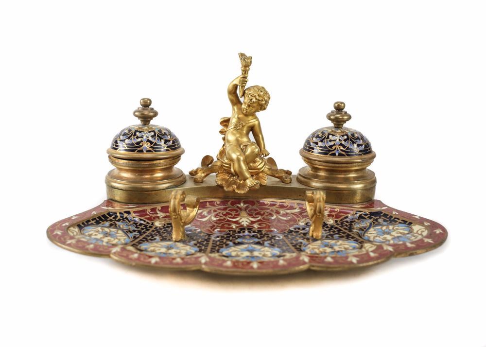 A very fine French champleve enamel and gilt bronze inkstand with pen rest. Features a figural cherub holding a torch in the center. Impressive champleve work. Late 19th Century.