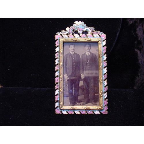 Beautiful 19th C. French bronze picture frame with turquoise, lavender and white enamelling. This frame measures 3 7/8" by 2 1/8" and has an easel back along with a ring to hang. Includes a tintype of two gentlemen. Circa 1880. Good condition.