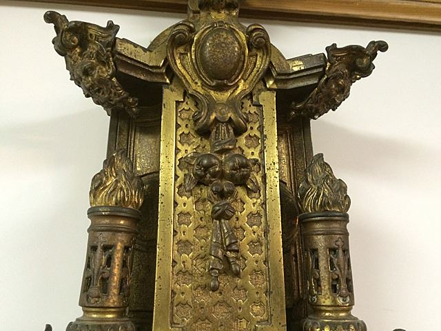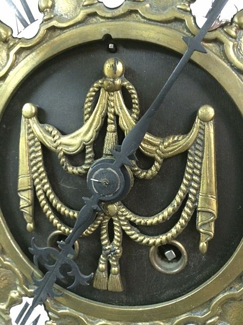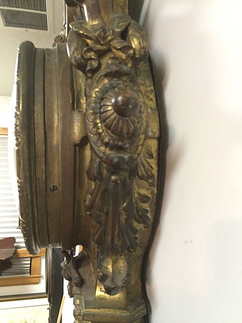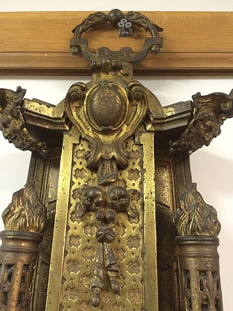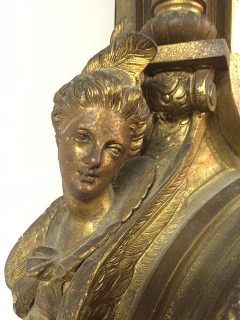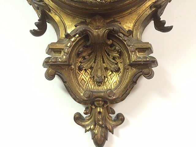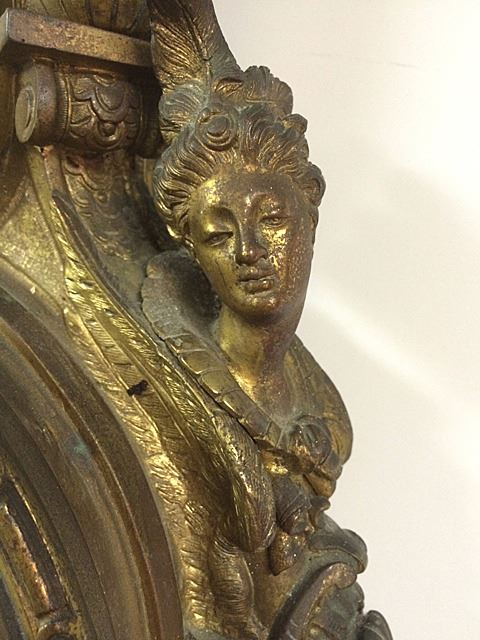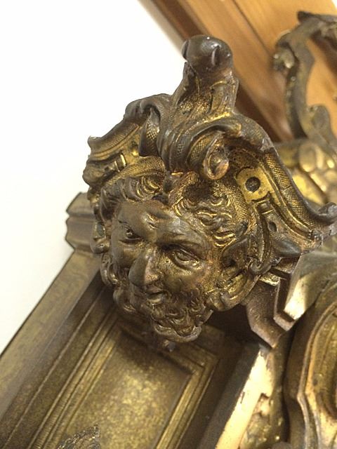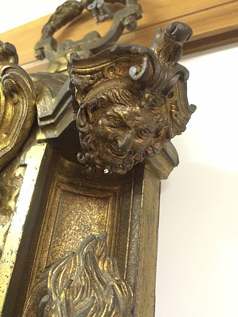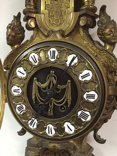 French, 19th c. Regence style Chartel clock with 8 day time strike, square movement, high grade original fine gilt finish, c. 1850. Great castings on this clock include female bust figurines on either side, one with eyes open and one with eyes closed, flamed torches, fruit, Northwind faces, scrolls, porcelain ornate roman numerial dial with gilt rope and drape, absolutely stunning French Chartel wall clock with attention to every detail. Measures approx. 31 1/2" high x 12" wide.