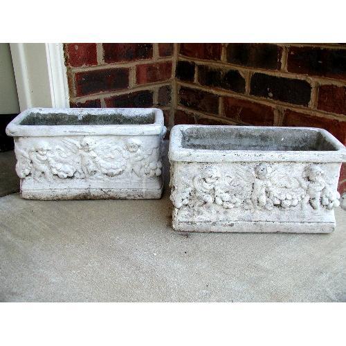 Beautiful pair of cherub late 19th Century concrete planters from France. Rectangular in shape and made of aged concrete. Raised cherubs with wings spread surrounded by floral and fruit cover all four sides. Most of the extremely dark areas seen in the photos are dirt from whatever planting filled the containers. Definite color aging naturally otherwise. Very heavy,unusual and cunning. Excellent condition.Drainage holes in bottom. Measure 15L X 8H X 7W.