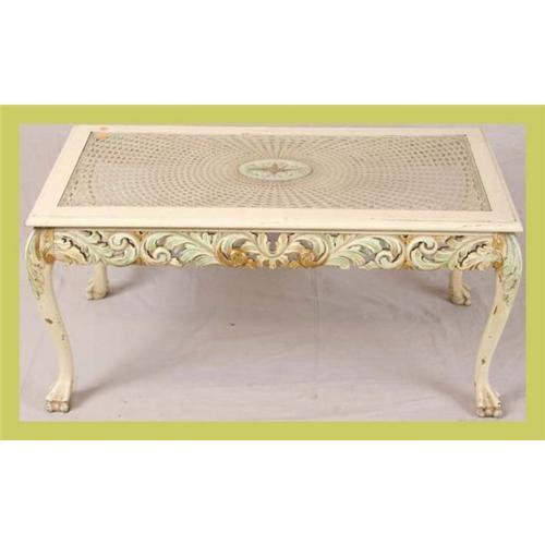 </STRONG>Title: 1940 French Chippendale Coffee Table Claw Feet Carved</STRONG><P>Item #: 4-34-0</P><P>Comment: This is a nice table with great carvings and painting! Glass top over rattan is very practical!</P><P>Condition: In overall good condition. There is considerable wear to the paint on the surface and legs, but this just adds to the charm of the piece.</P><P>Dimensions (in.): 20H 39.5W 20D </P><P>Age (ca.): 1940</P><P>Origin: France</P><P>Style: Chippendale</P><P>Material: Painted Wood</P><P>Material 2: Rattan</P><P>Material 3: Glass</P><P>Object: Coffee Table</P><P>Subject: Claw Feet</P><P>Additional Detail 1: Carved</P><P>Piece Type: Tables</P>This piece is eligible for FREE SHIPPING within the Continental United States. Shipments generally take between 2-10 weeks, depending on shipping company used. Shipments measuring less than (inches) 30 x 47 x 84 and weighing less than 100 lbs per box or item may be shipped via Greyhound Buslines, at the discretion of EuroLux Antiques. Shipments using Greyhound will require the customer to pick up the piece at their nearest Greyhound Bus Station (within 40 miles of customer's home). All shipments include Insurance. Additional assembly, extra packing ...