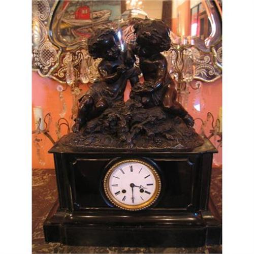 19th-century French clock in black marble with cherubs in spelter. Decorative (has not yet been restored to working order).