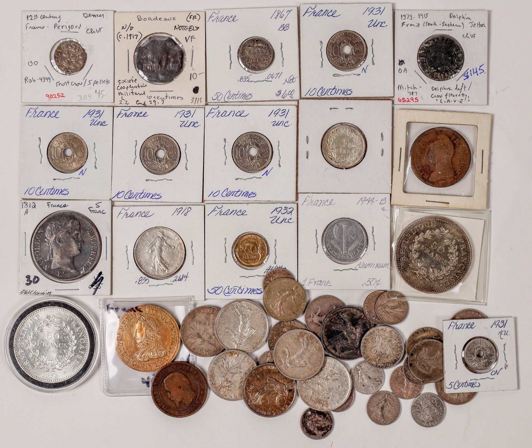 Lot of over 40 coins from France. 1812 five franc; 12th century perijord; 1400 dolphin jetton; uncirculated 5 & 10 centimes (5); 1867 50 centimes; 50 francs, 1977 & 1979; 1918 two francs. Two dozen loose coins, some holed, mostly silver.