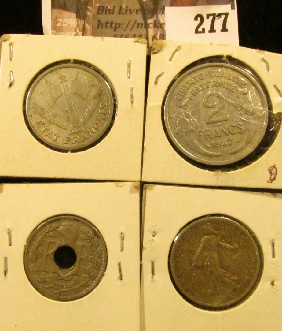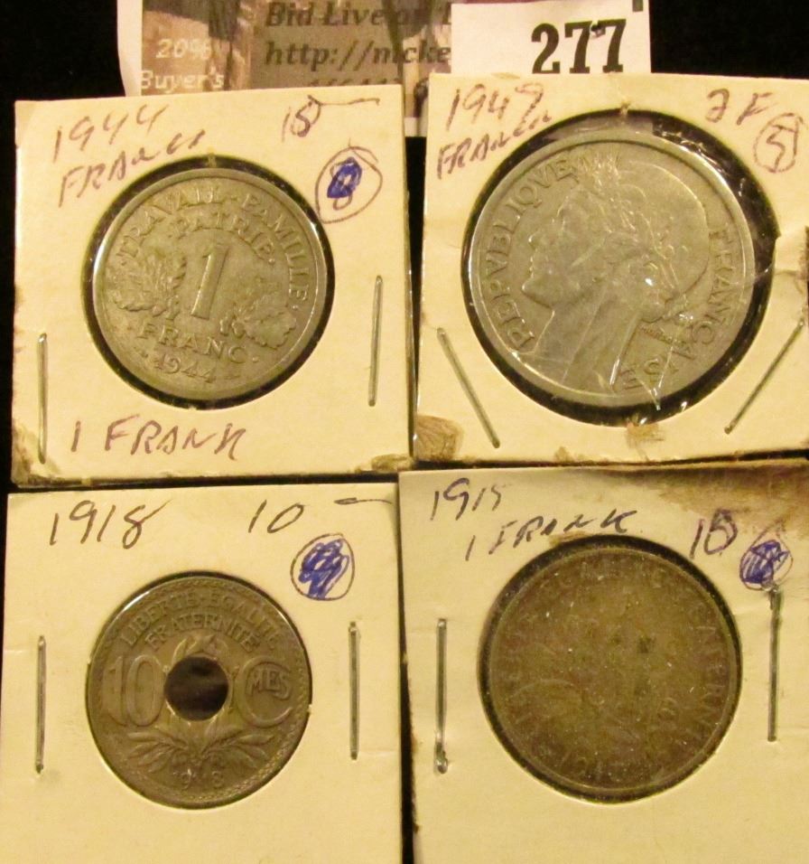 French Coins: 1918 Ten Centimes, 1947 Two Francs, 1915 & 1944 One Franc.