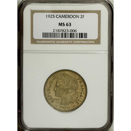 <B>French Colonial 2 Francs 1925, </B></I>KM3, MS63 NGC, very scarce grade.<BR><BR><b>Shipping:</b> Coin/Currency (<a target="_blank" href="http://www.heritageauctions.com/common/shipping.php">view shipping information</a>)
