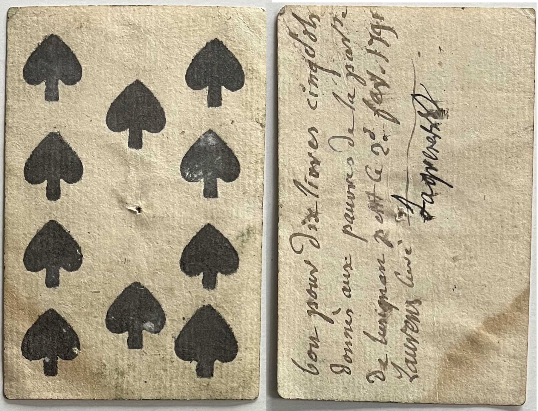 French Colonial Issue Playing Card; "Ten of Spades" with French Hand Written on the back.
