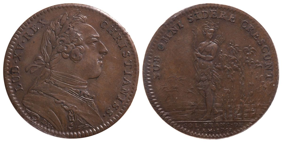 9 Denier 1721B. Breton-510. Obv: Bust of Louis XF r; Rev: Indian Princess advancing l. ICCS graded Choice Extremely Fine-45 Copper. Original.