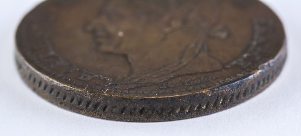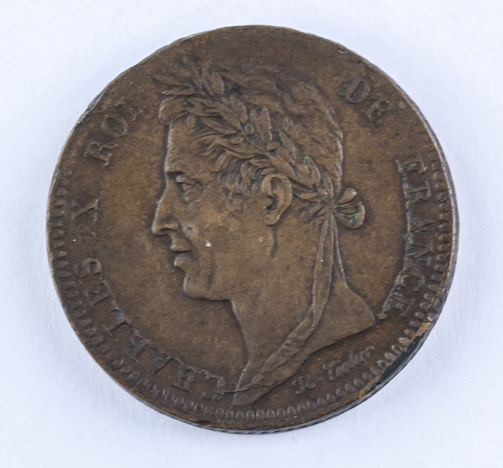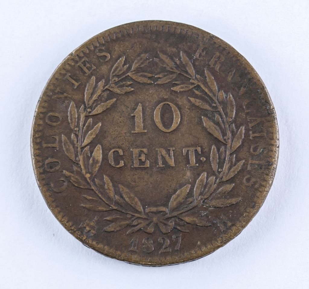 French colony coin. Obverse: Charles X laureate head left. Lettering: CHARLES X ROI DE FRANCE. / NP. TIOLIER. Reverse: Denomination within wreath, date below. A trident near the rim, at 7 o'clock. Lettering: COLONIES FRANÇAISES / 1827 H / 10 CENT. 18 grams, diameter: 3.5 cm.