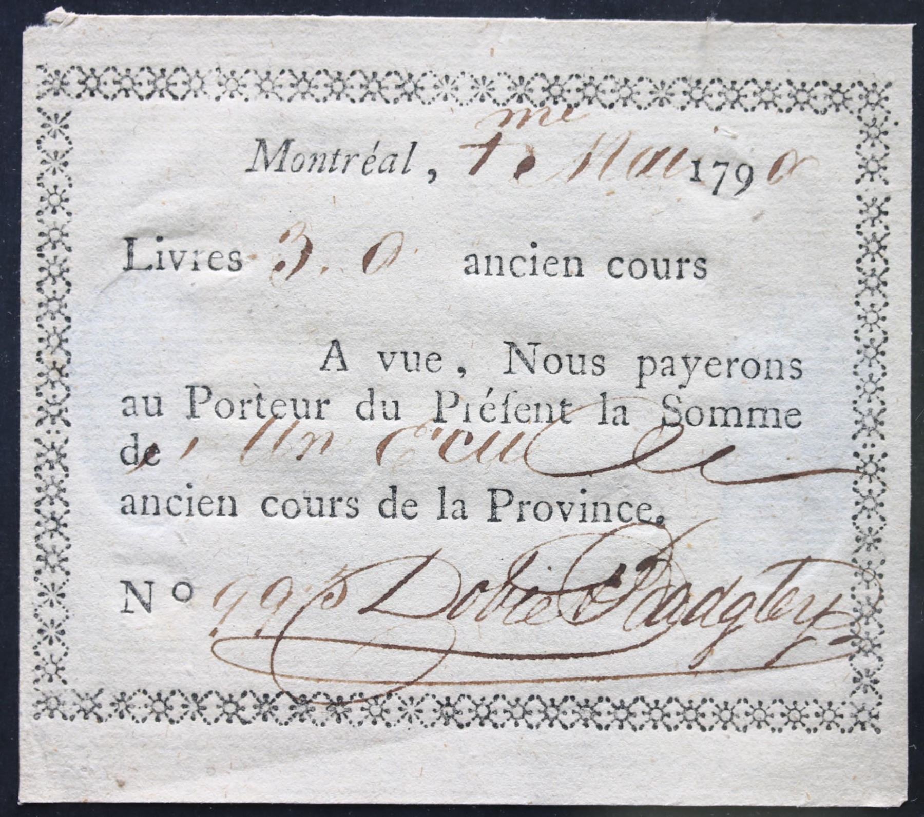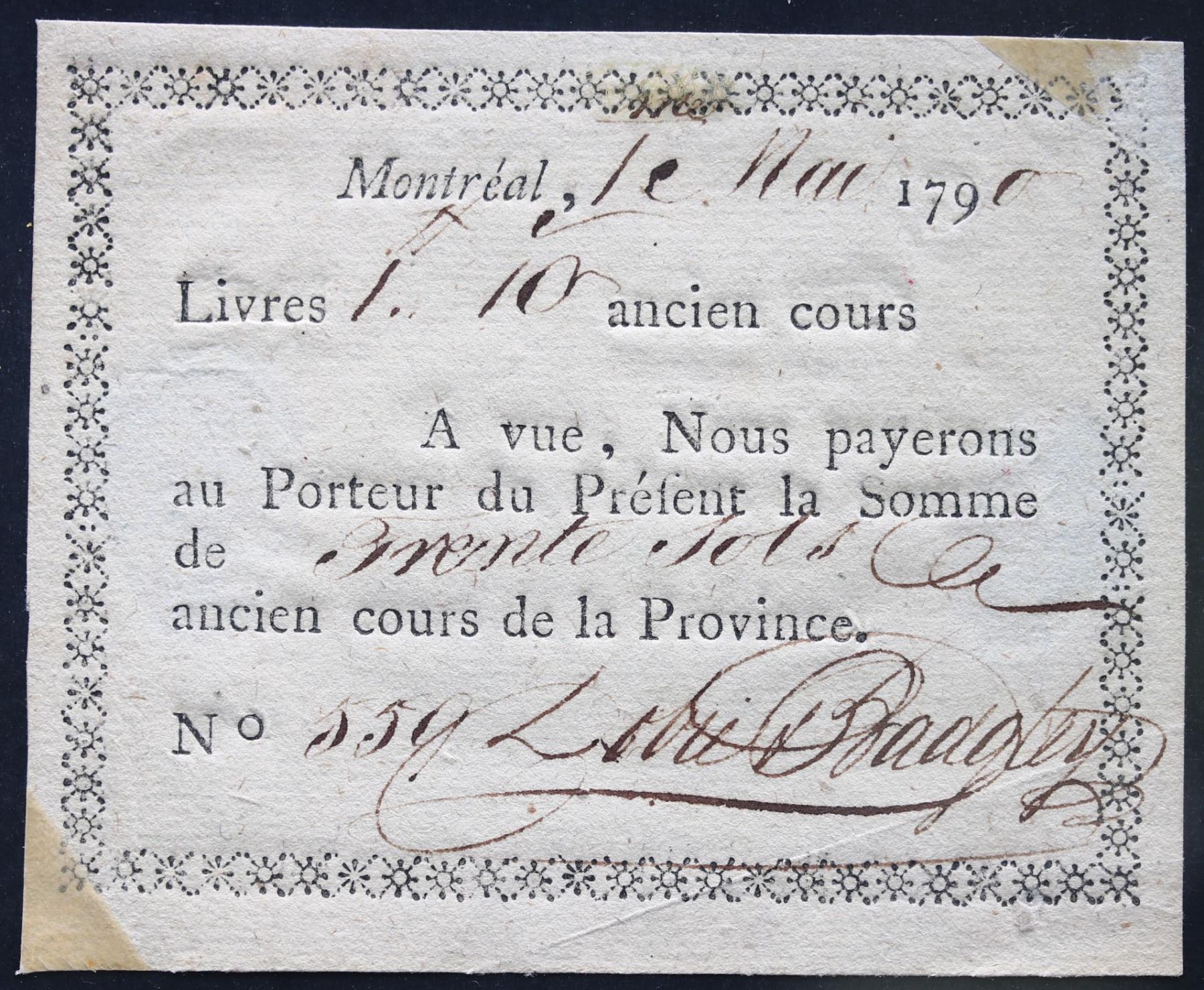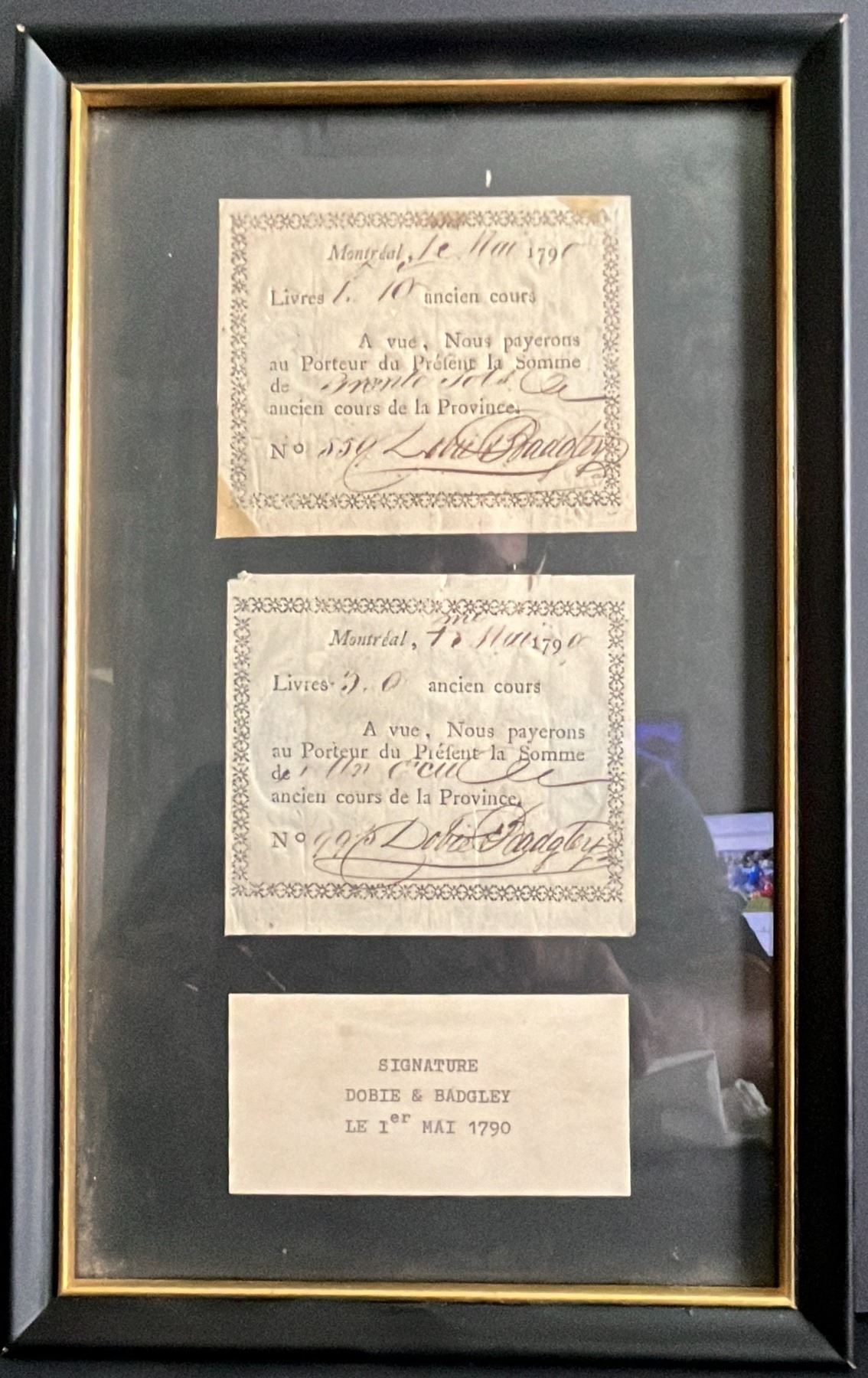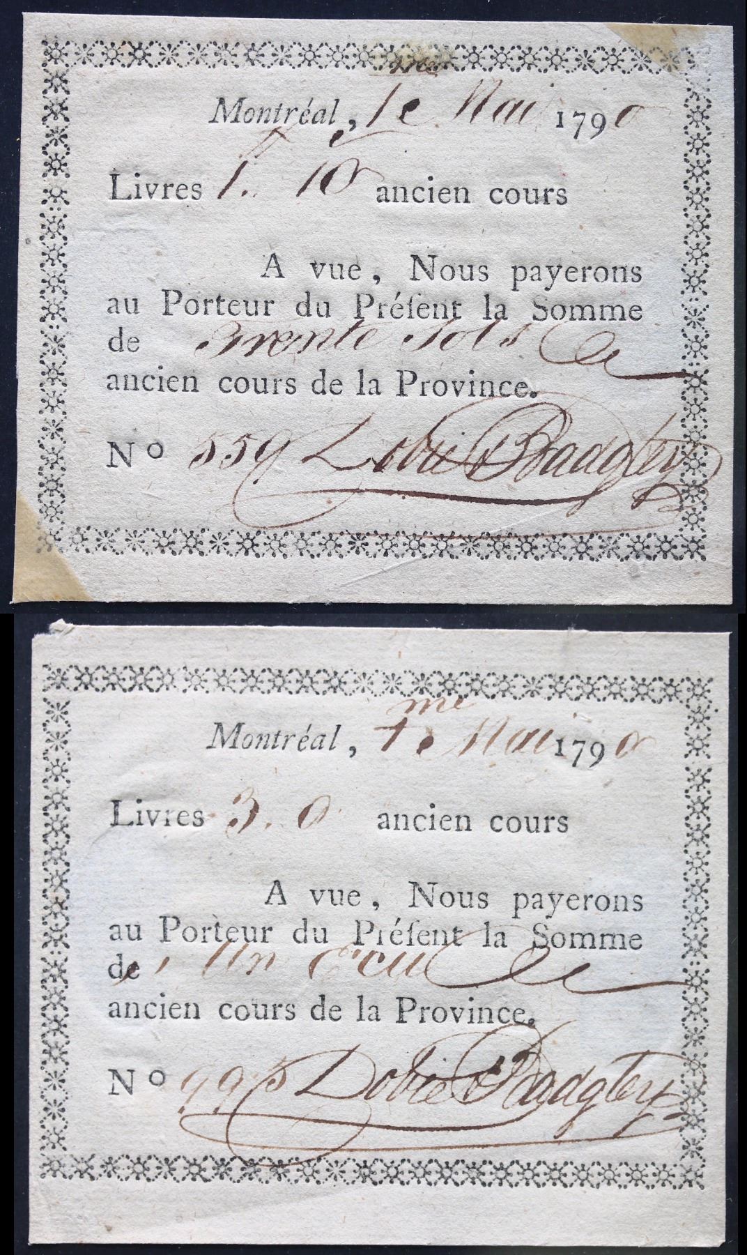 French Colonies; 1790 Dobie & Badgley Notes includes 1 Livre 10 Sols (30 Sols) QC130-10-04 & 3 Livres (Un Ecu) QC130-10-06 . Lot of 2 rare issues in frame.