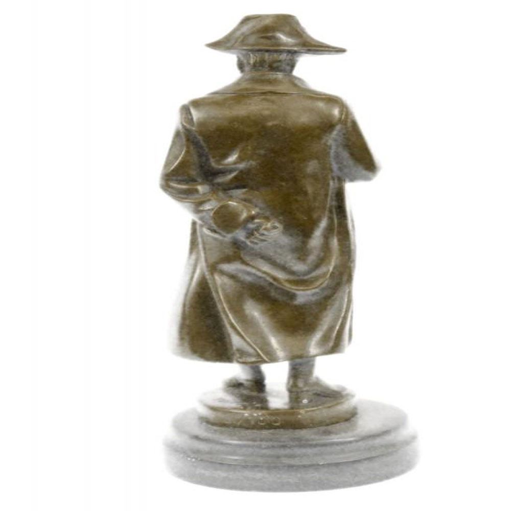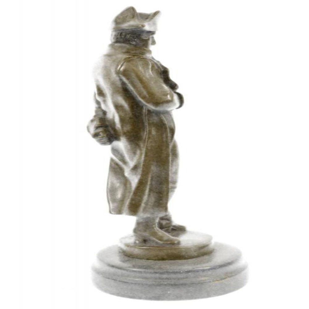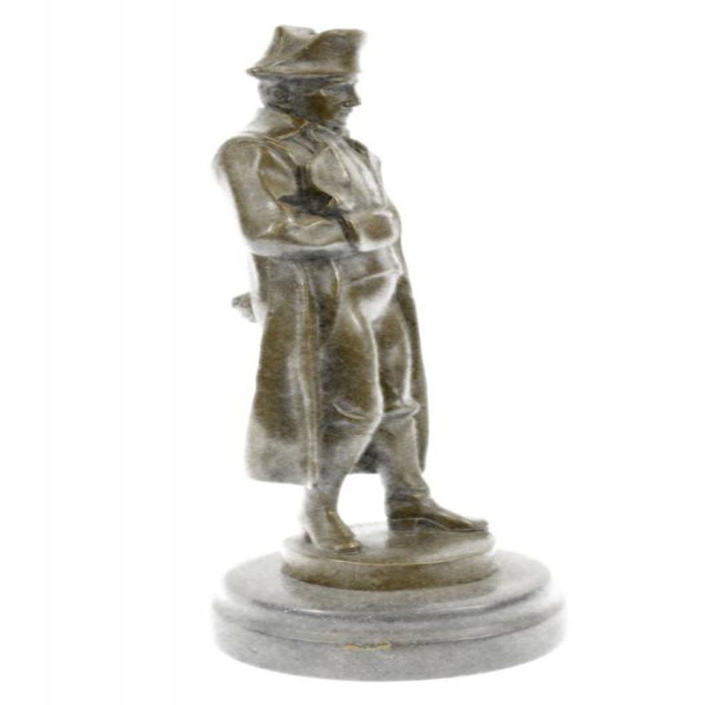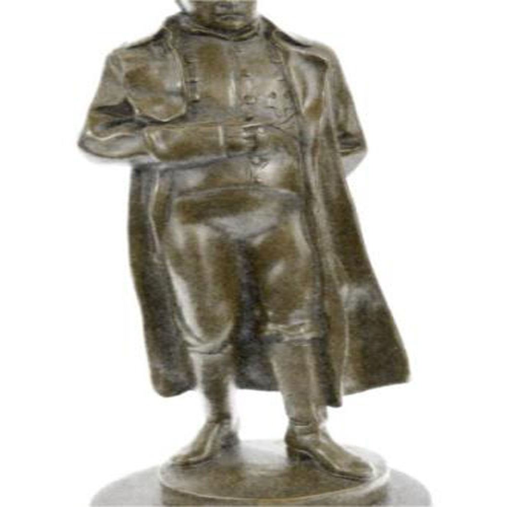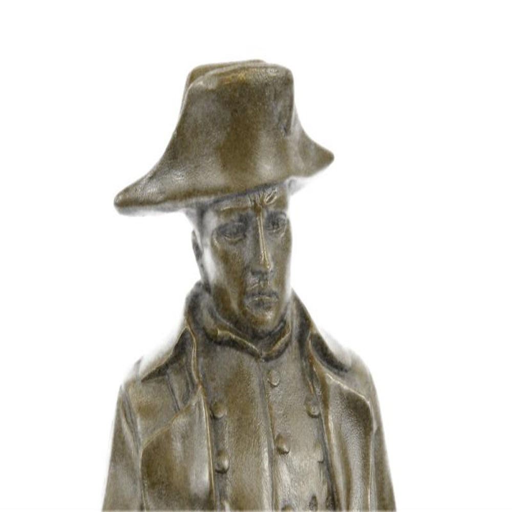 This is a Bronze honoring the French commanding martial giant Napoleon Bonaparte 15 August 1769 - 05 May 1821. As Napoleon was Emperor of the French from 1804 to 1815. His legal reconstruction, the Napoleonic code, has been a major influence on many civil law administrations worldwide, but he is best remembered for the wars he led against a series of coalitions, the socalled Napoleonic Wars, during which he established dominion over much of Europe and sought to spread revolutionary ideals. The beholder witnesses him standing straight ahead with proudness, his fanning fortune after all, finally defeated at the Battle of Waterloo in June of 1815. The Sculpture was cast using the archaic method of lost wax casting and stained with a brown patina finish for perpetuation. Bronze Dimensions with Marble Base: Height 11 X Width 5 inches. Weight: 6 LBS.