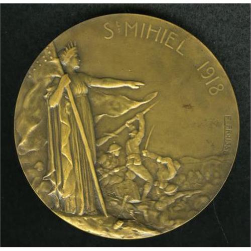 <B>World War I French Battle Medal Commemorative.</B></I> 68 mm, 142.6 gm. 1918 medal struck to commemorate the American victory in First World War battle of St. Mihiel, where the American troops broke the resistance of the enemy and captured 13,000 prisoners. Engraved by F. Fraisse.<BR><BR><b>Shipping:</b> Coins & Currency (<a target="_blank" href="http://www.heritageauctions.com/common/shipping.php">view shipping information</a>)