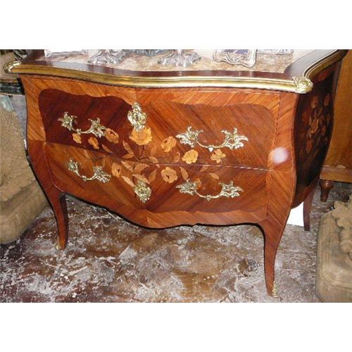 This is a superb French marble topped inlaid commode chest buffet server with two drawers and ormolu details. The marble top is set in and the edges are trimmed in bronze banding...an unusual feature. This is beauty!!!