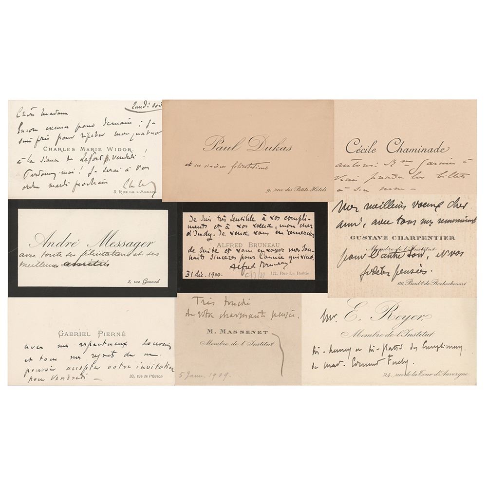 Group of nine personal calling cards of French composers, all annotated in their own hands, with a few signed. Includes: Jules Massenet, Cecile Chaminade, Charles Marie Widor (signed), Gabriel Pierne, Andre Messager, Paul Dukas, Alfred Bruneau (signed), Ernest Reyer, and Gustave Charpentier. In overall fine condition.