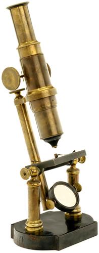 French Compound Monocular "H. Müller", c. 1875 Large French brass microscope, marked on the tube "H. Müller", japanned cast iron base, 2 brass tubular pillars supporting the stage plate with revolving blends, double mirror, milled-head pinion, 18 in. high when closed. - A very nice microscope in very unusual design!<Br>