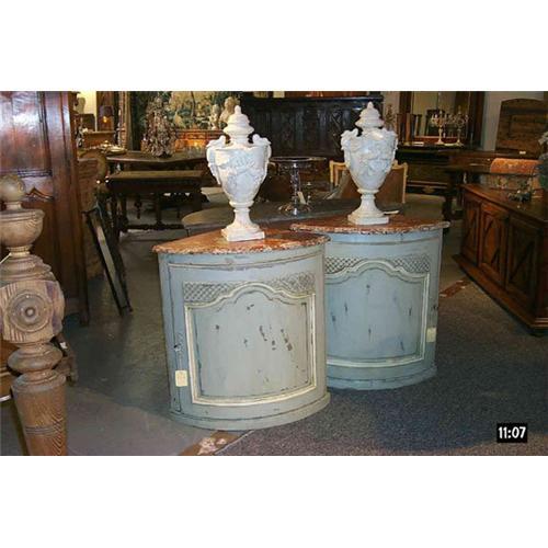 This is a pair of European pine corner cabinets from France. They are from the late 1800's, yet remain in good antique condition. The marble is a faux rouge, while the styling can be considered Louis XIV. Besides being used as traditional corner pieces, they could also be put together to form a semi-circle sink holder for a bathroom!