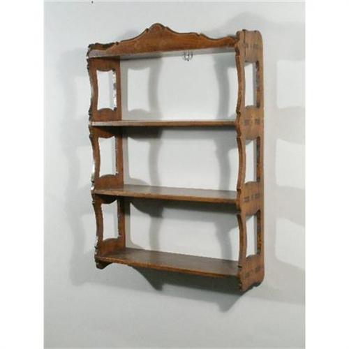 French Country Wall Shelf - Fruitwood, shaped crest and stiles, open sides. Three shelves with through mortise. Some insect damage in the form of small holes, actually enhance the look. 27"h x 19.5"w x 6"d