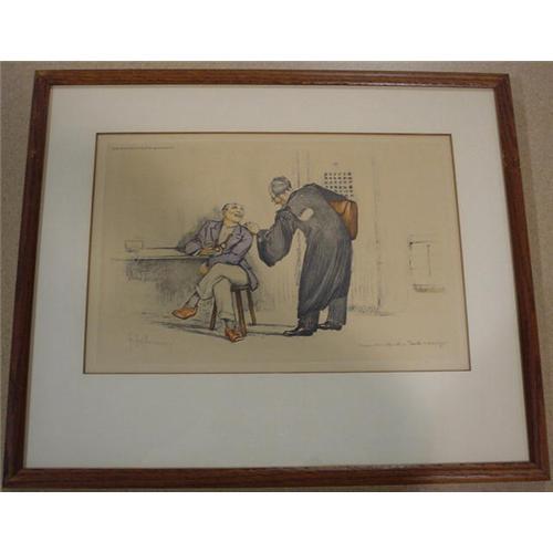 This is a print of an attorney greeting a gentlmen seated at a table. The print is signed by G Hoffmann. The upper left corner is marked with the following information. "Copyright by Ch Ducher 35 Avenue de l 'Opera__ Paris __ No. 575. The lower right is the title Mon cher client..tout o'arrange The frame is a medium wood finish and the matting is neutral. This is a series of 7 prints. They are all matted and framed the same. Please see the pictures of the other prints listed on our site.