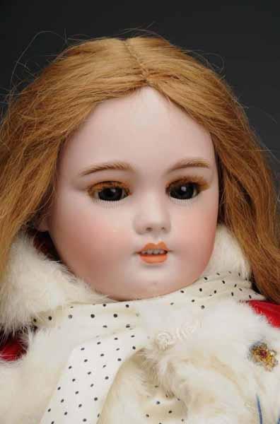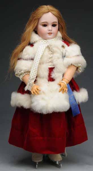 Description France, Ca. 1900. Bisque socket head with inset glass eyes with very long real eyelashes, painted lower eyelashes, pierced ears, open mouth with upper teeth, chin dimple, vintage human hair wig (glued down tight). French jointed wood and composition body with refinished hands and lower legs (wear and soil). Redressed in velvet and silk skating outfit. Condition (Very Good). Size 26" T.