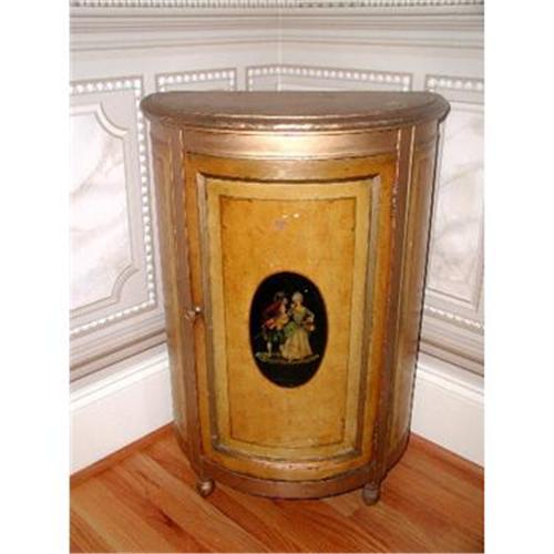 Gorgeous mustard colored demi-lune French cabinet early 1900's with hand painted antique gilt panels on either side and black oval center front with couple depicted in dress of th day. Gilt top and panel fronts sides. Great size for side table turned either way or a stand alone for many areas.
