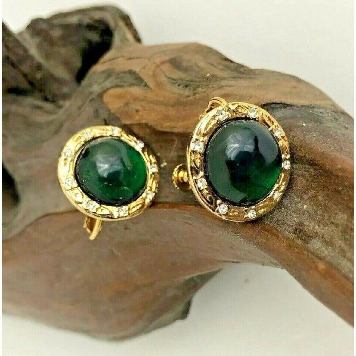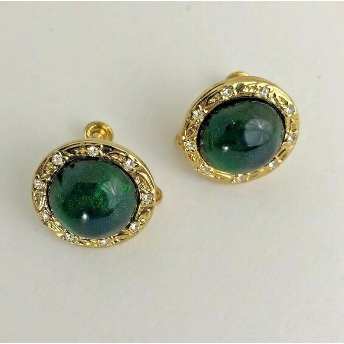 French designer CACHAREL, green stone & crystal gold plated screw-back earrings. 3/4"D.