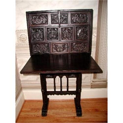 Rare early 18th century or possibly earlier black walnut French desk. The two piece unit with heavy carving on the upper box face of an urn with flame surrounded by 2 mythological creatures holding 10 acantus leaf and mythological creatures carved drawers was for the landlords use to carry in his carriage and set up in the filds to collect rent and taxes. Long metal latch with keyhole to the right,working lock,no key. The carved stands' legs with two inner twist legs fold inward for space saving on the journey. Two slides behind the carvings at mid point to support the desk top when open. Countless uses besides as a desk. Excellent condition,rich patina. Measures 25.5L X 12D (box 9.25D)closed,25D,open 49.5H Additional photos available.