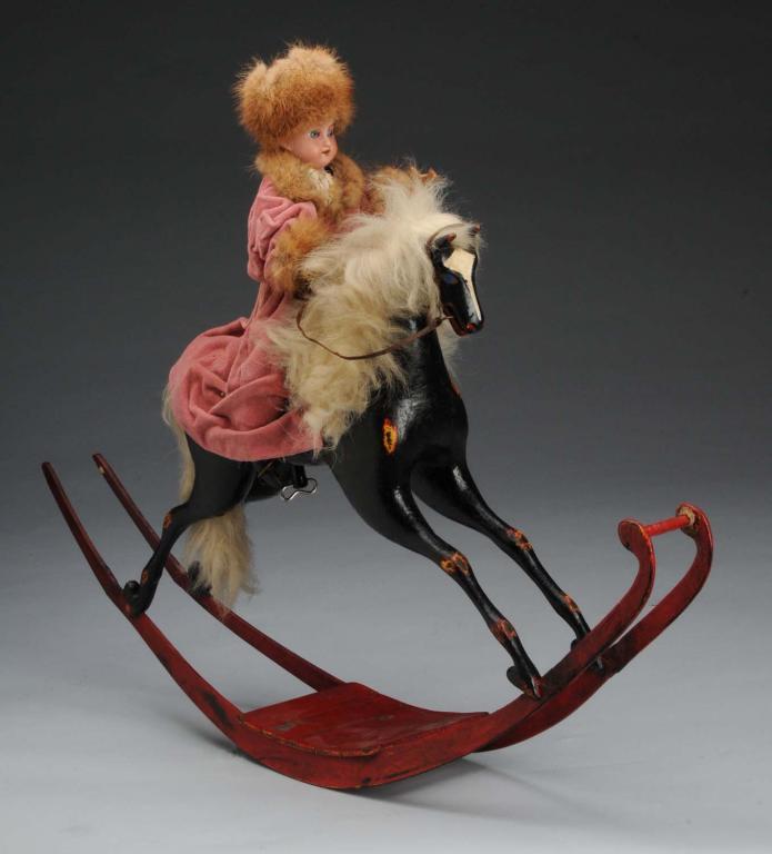 Description All original bisque doll riding painted horse. Original paint on horse. Old repairs to wooden rocker on both ends near horse's feet. Windup mechanism makes doll move in rotational fashion, causing the horse to rock. Condition (Excellent). Size 25" x 20".
