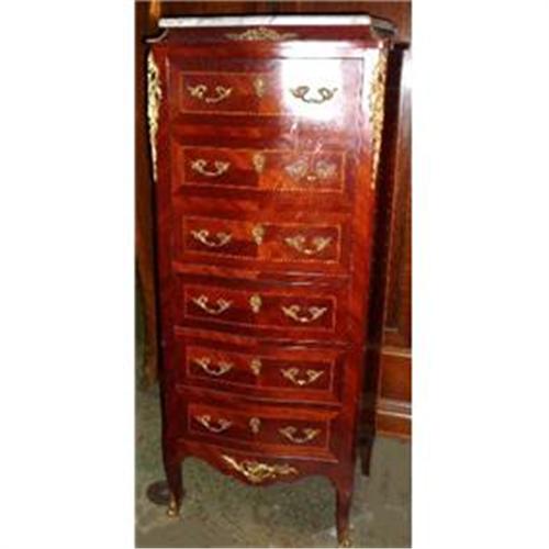 This is a fabulous marble top,drop front, French inlaid and mahogany desk/chest of drawers with ormolu details. There are two small storage drawers and two shelves in the desk compartment and three large drawers at the bottom of the chest.