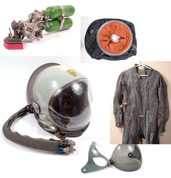A green nylon, partial pressure suit is included with an ID label that reads, in part: "Compinaision Stratospherique EFA Type 30 / Date: 7 68, No. 635, Etudes et Fabrications Aeronautiques, Clichy". The suite has hoses at the wrists for partial pressure gloves (not included) and appears to be in excellent condition. Less than 450 of these suits are recorded as having been issued.