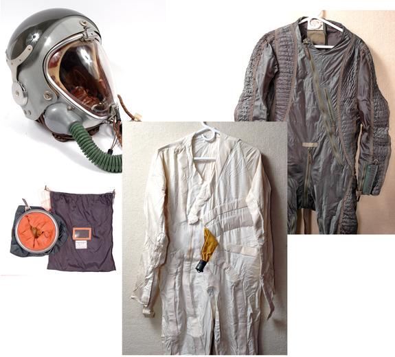 A green nylon, partial pressure suit is included. The ID label reads, in part: "Combinaison Stratospherique EFA Type 30 / Date: 6 68, No. 625, Etudes et Fabrications Aeronautiques, Clichy". The suite has hoses at the wrists for partial pressure gloves (not included) and appears to be in generally good condition. A green nylon bag with matching ID label is also included. Less than 450 of these suits are recorded as having been issued.