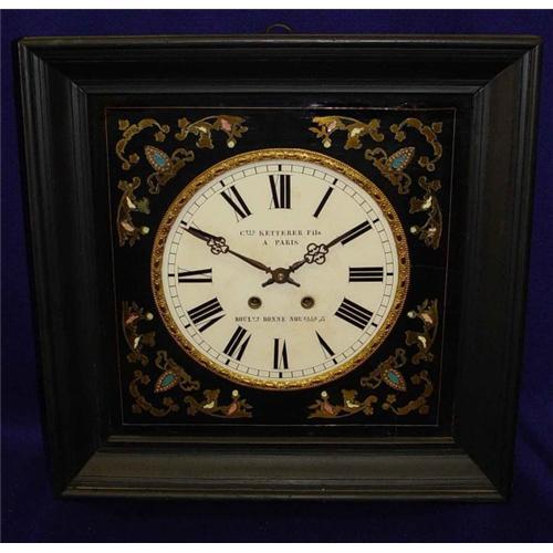 Fantastic 19th century French baker's wall clock with an ebony case inlayed with brass and enamel design work, high relief bronze chapter ring, white enamel dial, open work hands Roman numeral hour designations, dial 9 1/2 inches diameter, signed Ketterer Fils A Paris Boulvt Bonne Nouelle,8; movement signed Blaquart a Bouheshner ? The timepiece measures 19 inches x 19 inches x 6 inches, weighs 11 pounds, charms on the half hour and on the hour (comes with key) and would make a fantastic gift or addition to any fine collection.