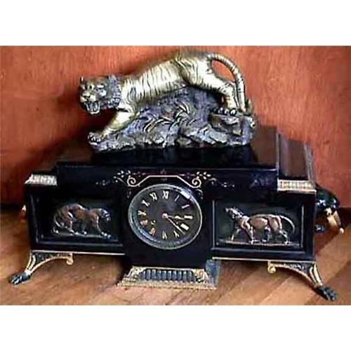 Fantastic 19th Century French Egyptian Revival Cougar Motif Charming Onyx Mantle Clock; beveled glass front and back views, raised egg and dart bezel, engraved and gilt Roman numeral designations, with fine gilt pear shaped hands, and has a sweet (bell) charm on the half and on the hour. The fine bronze tiger atop the mantle, is not (physically) attached, and not original to the clock, however does come with the clock, which has chaffed egg and dart bronze molding along the frieze, and pair of high relief cougar face masks with bronze carrying handles at each side, a pair of carved cougars adorn the beveled onyx face, with a centered engraved gilt floral design above the clock face, and fine gilt bronze acanthus leaf and scroll worked central column base, and has fiercely realistic, high relief, gilt bronze cougar paw feet. This clock would make a fantastic gift or addition to any fine collection 22" l x 10 3/4" w x 8 3/4" h.